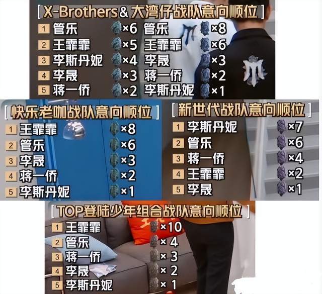 我们可以看到,每个团都有自己的第一选择,X-brother和大湾区的第一选择是管乐,TOP登陆少年和快乐老咖的第一选择是王霏霏,新时代的第一选择是李斯丹妮,五个团都将李晟放在第三选择和第四选择,出现这样的情况,网友们非常好奇为什么。