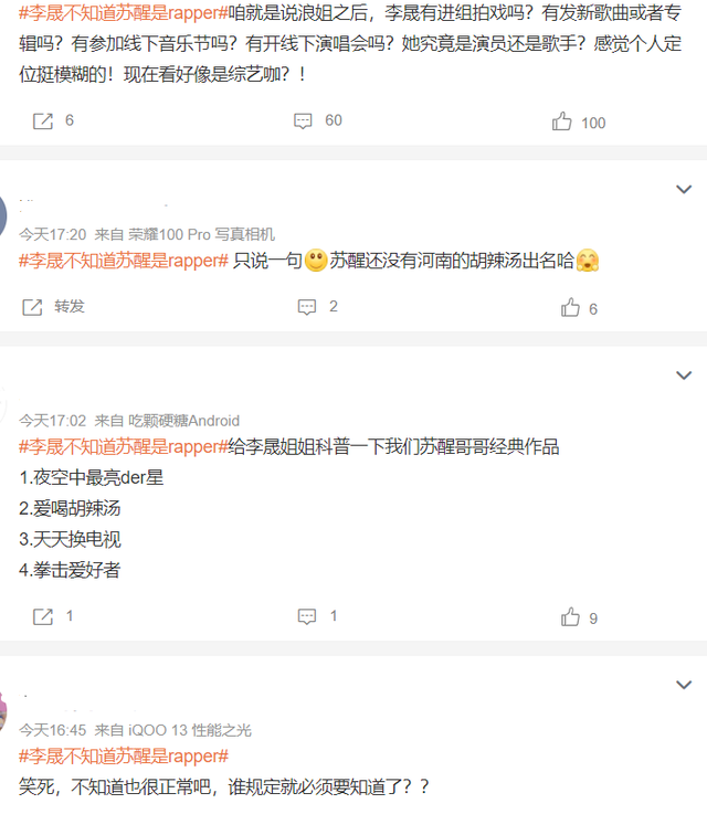 在录制的过程中,节目组准备一些网友提问的问题,姐姐们去询问哥哥,当时李晟问早安,如何作为唯一一个没在说唱战队的说唱歌手,你作何感受,这个提问提出之后,哥哥们就看向苏醒,这个时候,很多观众才反应过来,苏醒也是一位说唱歌手。